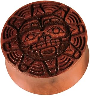 Lobe Plug Flesh Tunnel aus Sawoholz in rotbraun mit Gesicht als Sonne, Herren Damen, Maori Azteken Style Ohr Piercing