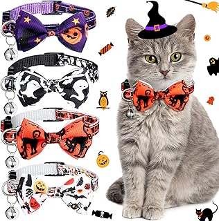 4 Stücke Halloween Katzen Halsband mit Glocke und Fliege Verstellbar Sicherheit Kätzchen Halsband Kürbis Fledermaus Katze Geist Süßigkeit Muster Fliege Halsband für Erntedankfest Halloween